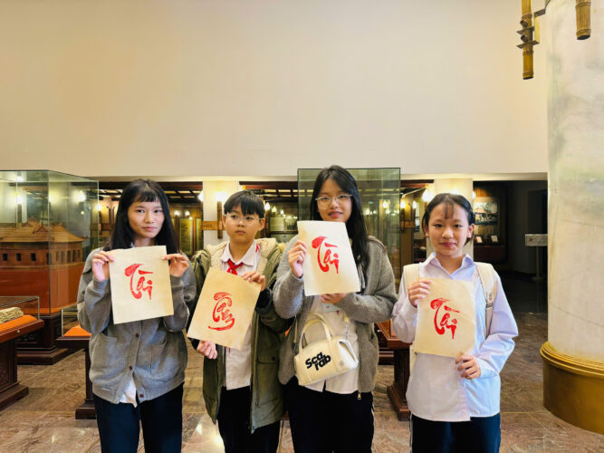 Kết thúc chương trình, các em tham gia hoạt động trải nghiệm in chữ “Tâm – Tài” trên giấy dó, góp phần giới thiệu nghề thủ công truyền thống và mang đến niềm vui khi trực tiếp hoàn thành một sản phẩm sáng tạo.