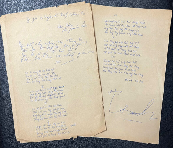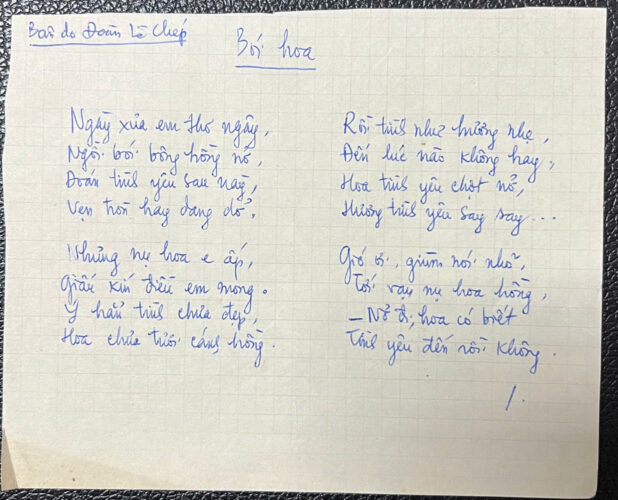 Bản chép tay bài thơ “Bói hoa” của nhà văn Đoàn Lê (1943-2017). “Khoảng năm 1989-1990, tôi hay đến chơi nhà cô Đoàn Lê ở làng Lủ, Thanh Trì, Hà Nội do tôi học cùng trường đại học ở Liên Xô với cháu ruột của cô là anh Trần Đoàn Lâm. Tôi rất ngạc nhiên khi biết cô Đoàn Lê mới là tác giả của bài thơ “Bói hoa” lãng mạn, trong sáng mà giới trẻ chúng tôi ngày ấy rất yêu thích và thường chép trong sổ tay. Nhưng hầu như ai cũng nhầm và đề tác giả bài thơ là nhà thơ lãng mạn Đức Heinrich Heine. Tôi đề nghị và cô Lê đã chép tay chữ rất đẹp cho tôi bài “Bói hoa” vào nửa trang vở học sinh, đề giản dị là “Bản do Đoàn Lê chép”.”