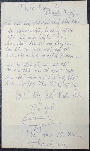 Bút tích bài thơ “Thời hoa đỏ” của nhà thơ Thanh Tùng được ông xin chép tặng và ký tên trong một lần dự hội thơ tại Quảng Ninh đầu những năm 1990, bởi quá yêu mến thi phẩm nổi tiếng này và ghi “Mến tặng Lê Xuân Sơn. Tác giả Nhà thơ Việt Nam – Thanh Tùng”.